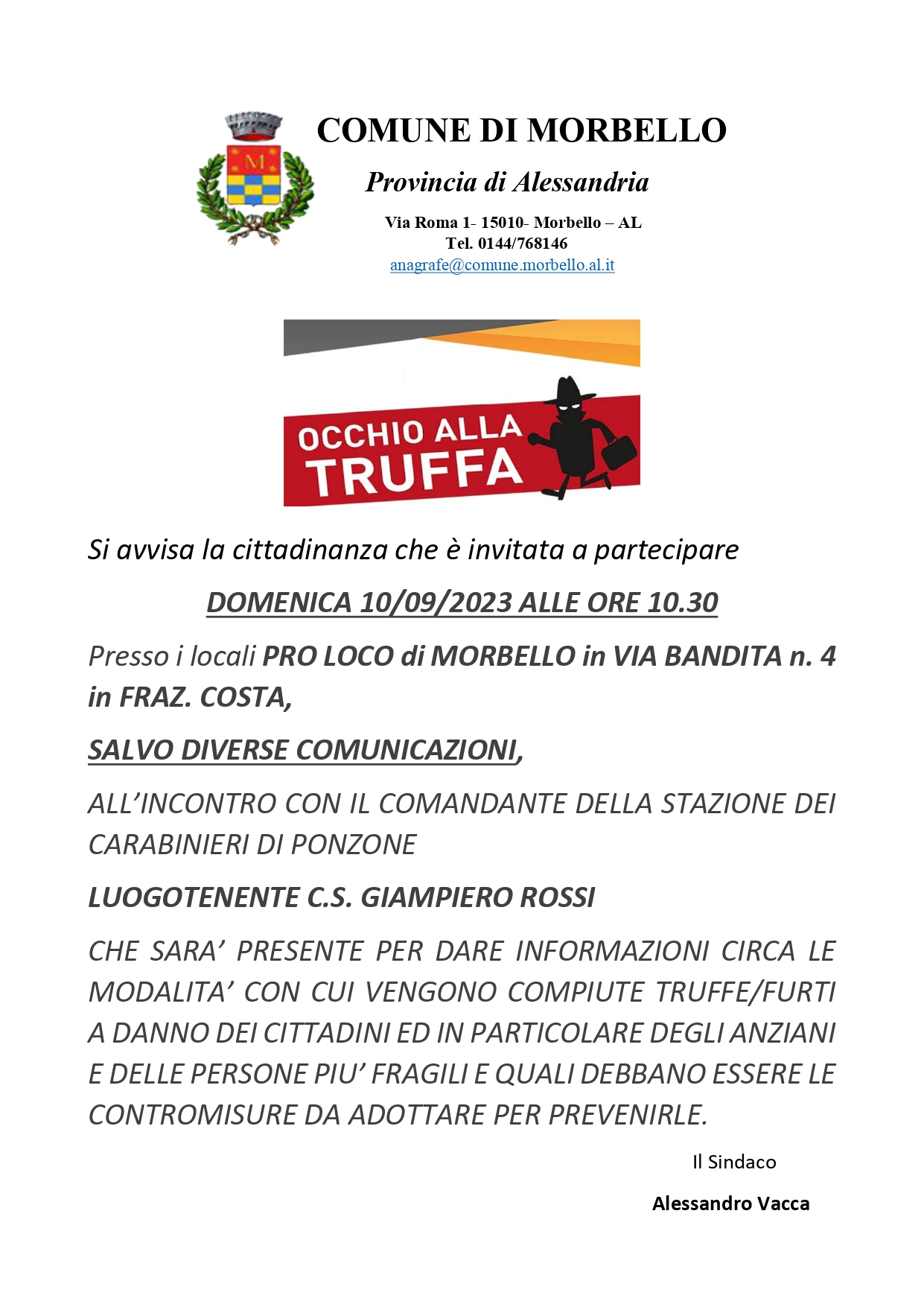 CHE SARA’ PRESENTE PER DARE INFORMAZIONI CIRCA LE MODALITA’ CON CUI VENGONO COMPIUTE TRUFFE/FURTI A DANNO DEI CITTADINI ED IN PARTICOLARE DEGLI ANZIANI E DELLE PERSONE PIU’ FRAGILI E QUALI DEBBANO ESSERE LE CONTROMISURE DA ADOTTARE PER PREVENIRLE