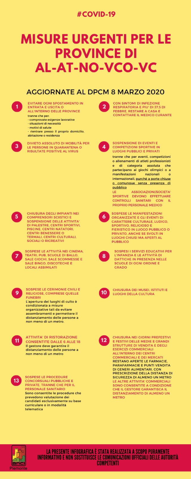 Allo scopo di contrastare e contenere il diffondersi del virus COVID-19 con D.P.C.M. 08/03/2020 nelle zone indicate nell'art.1 del DPCM, TRA LE QUALI LA PROVINCIA DI ALESSANDRIA, sono adottate le misure riassunte nell’informativa ANCI Piemonte di seguito riportata.