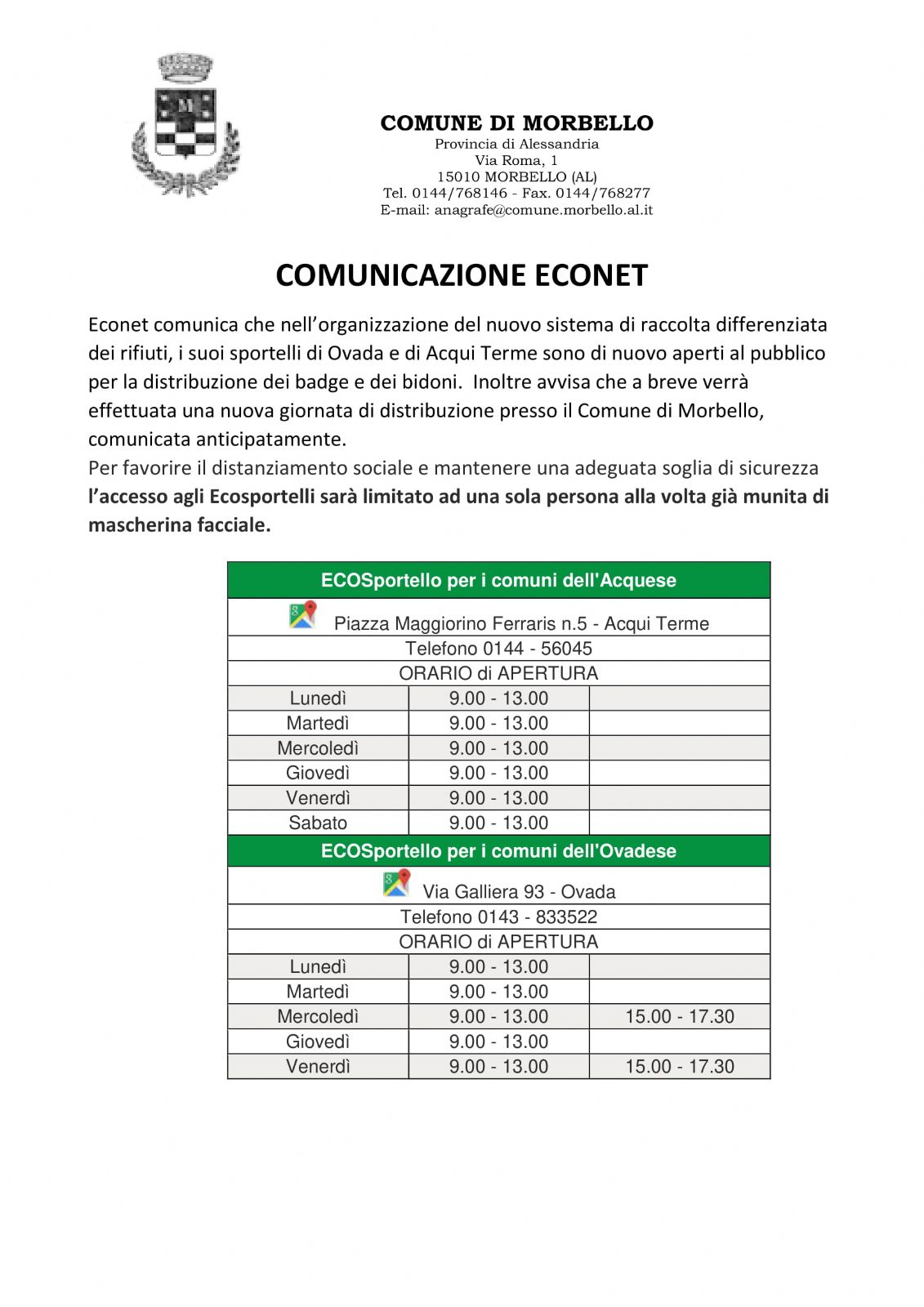 Econet comunica che i suoi sportelli di Ovada e di Acqui Terme sono di nuovo aperti al pubblico per la distribuzione dei badge e dei bidoni e per rispondere a tutte le informazioni necessarie per il nuovo sistema di raccolta.